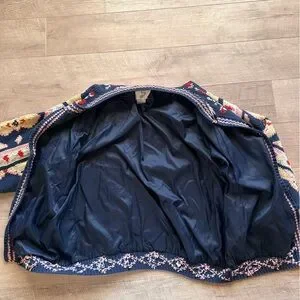 The sleeves and outline along sweater remind me of playing cards. Had patches. Buttons up/down. Size reads Missy Large and is accurate. Has sort of a sporty varsity vibe.