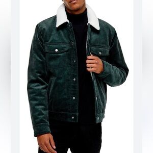 dark green corduroy shell and a plush, cream-colored sherpa (fleece) lining on the collar and body to provide warmth.