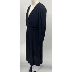 Keywords: made in USA 1970s seventies 70s 80s eighties 1980s lbd little black dress wrapdress cinched waist belt buckle blouson blousy flowy fit and flare surplice vneck pleated pleats flattering unique classy classic chic night out romantic feminine mini dress midi dress knee length elegant sophisticated timeless glam embellished crystal beaded disco