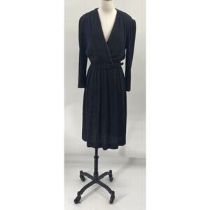 Vintage 70s 80s Rhinestone Neckline Pleated Faux Wrap Dress Belted Black