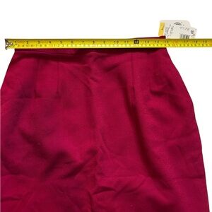 Chic and vintage new-with-tags Jones New York wool cranberry jacket and skirt suit. Pockets on jacket and skirt. Back zip on skirt. Features a bold cranberry hue. Sewn in shoulder pads. Perfect for professional or casual wear. 100% wool, both jacket and skirt are lined. Size 12.