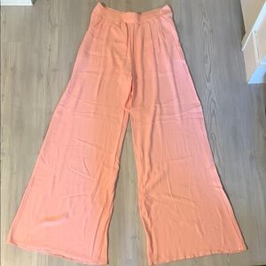 These pink wide-leg pants feature a high-waisted design and a flowy silhouette, perfect for adding a touch of elegance to your wardrobe. The full-length cut and soft fabric ensure both comfort and style for any occasion.