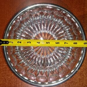 Beautiful crystal bowl with a shiny metallic silver rim. Perfect for decor to add a touch of drama to the fruits on your counter or possibly hold some pinecones and all their secrets ssshhhhh.