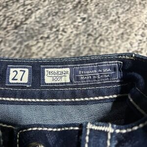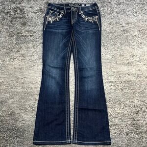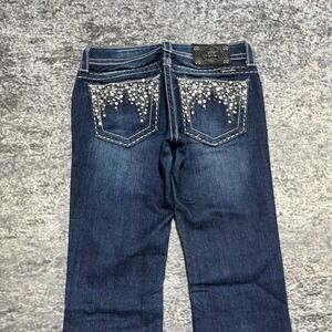 Miss Me Jeans Boot Cut Low Rise Flared Western Alt Cute Cyber Grunge Embellished Rhinestones Pockets Blue Denim Womens 27 (27x32)
