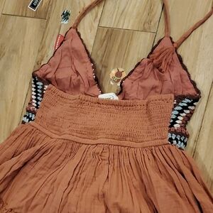Rust-colored halter dress with tiered skirt. Crochet detail on bodice. Elastic back, adjustable. Tie-neck. Partially lined. Tag is coming off a bit, noting for transparency!
