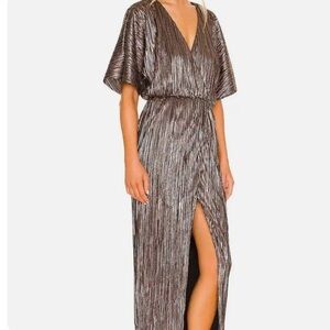 Holiday is here and this dress is Gorgeous!! Its fully lined, in a beautiful gunmetal pleated metallic which a surplice bust with a faux wrap detail and a slit!! You can dress this with your favorite belt or add a pin, as pictured! This dress is brand new with tags and in a size x-small! Its sold out online in this size and color-way!