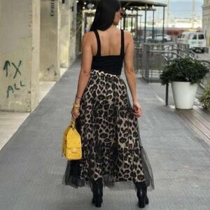 Stylish leopard print maxi skirt. Features elegant black tulle overlay. Perfect for a bold look.