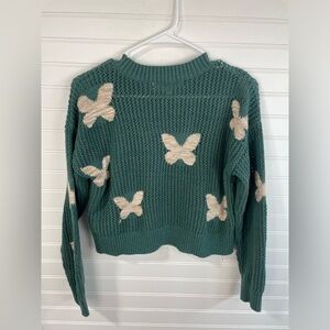 Sugar Moon Green & Tan Knitted Butterfly Cropped Sweater Size Large Girls EUC