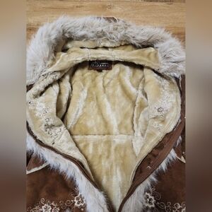 The product is a vintage Y2K Big Chill faux suede/ fur coat in brown, designed for girls ages 14-16. The mid-length coat features long sleeves, a zip closure, and a hood for added warmth. The coat is accented with fur trim, rhinestones, and embroidery, giving it a unique and stylish look. Made with polyester insulation, this coat is machine washable and perfect for casual occasions during the winter, fall, and spring seasons. The bohemian and 90s themed coat is a fashionable choice for young girls looking to stay warm and trendy.