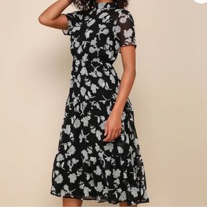 Get a lovely look for an evening out with the Lulus Floral Dressed Up Black Floral Print Midi Dress! Elegant cream and black floral print decorates lightweight woven chiffon as it forms a mock neck (with back button closure), sheer decolletage, short sleeves, and a darted bodice. Elastic waist tops a tiered skirt that flows to a modest midi length. Pair with strappy heels and a clutch for the perfect date night 'fit!