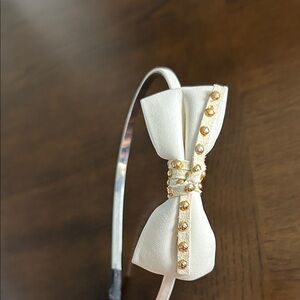 Cream headband with a stylish bow and gold embellishments. Ideal for a chic look.