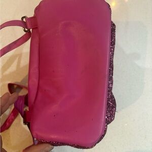 Shiny pink backpack with Barbie design. Features glittery finish and zip pockets.