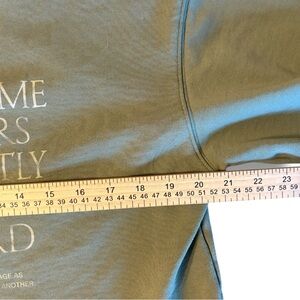 Green sweatshirt with inspirational text graphic.