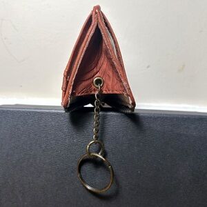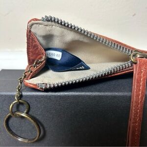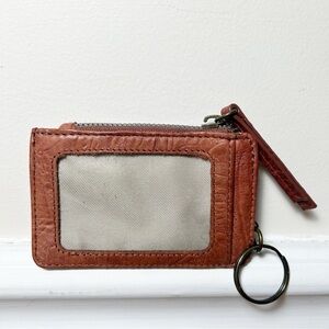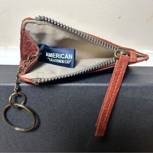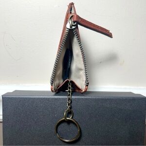Zip closure, ID window, 2 card slots, 1 slip pocket, interior zipper compartment. Includes key ring that can be tucked inside.