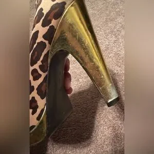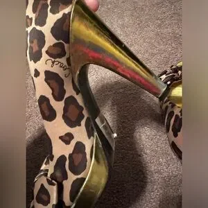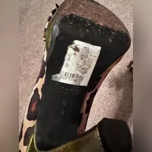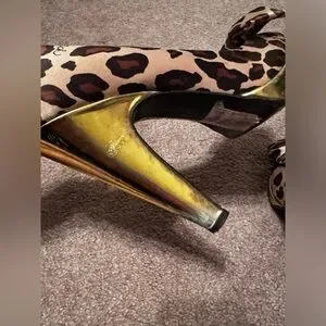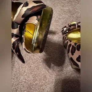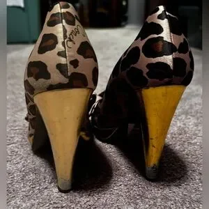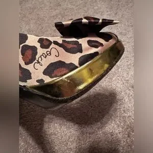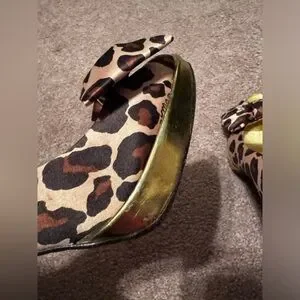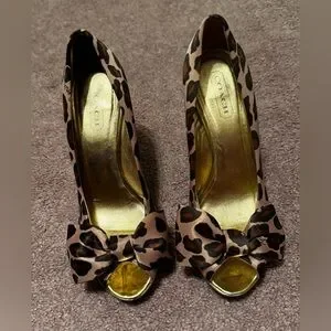 Vintage, Y2K era Coach Daisy Leopard Print Peep Toe Heels in size 8.Featuring a satin upper part with bow design in the front in a leopard animal print and gold bottom heel. Heel is about 4’inches. Made in Italy.