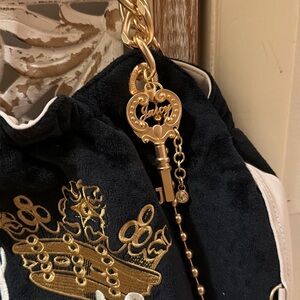 Elegant black bag set with gold accents. Includes matching pouches. Stylish chain details. Iconic Juicy Couture logo.