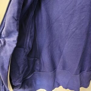 Chic deep blue utility jacket with hood. Features front zipper and pockets. Ideal for casual wear.Missing neck/hoodie cord, minor wear on fabric.
