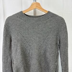Crew neck, long sleeves, thumbholes, pullover style, side-vented hem, slightly tapered shape. Cozy merino wool ribbed knit with pointelle details. Gray.
