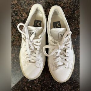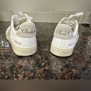 Chic Veja sneakers with a minimalist design. White leather with gray accents. Ideal for everyday wear.