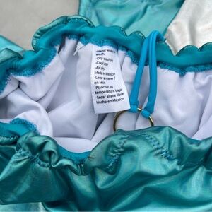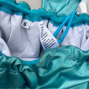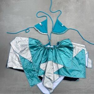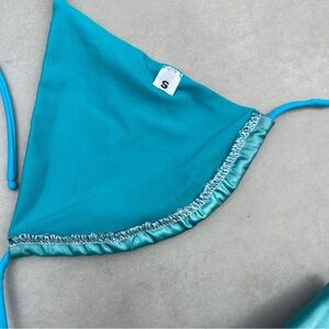 Stylish teal and silver patchwork bikini set. Features a unique geometric design.