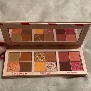 P. Louise 'Fall In Love' eyeshadow palette with romantic design. Features shades of red and pink. New, never used.
