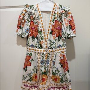 Vibrant dress with floral patterns. Features puff sleeves and a V-neckline. Ideal for lively occasions.