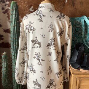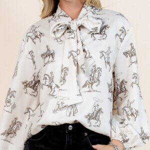 Western charm with a polished twist. This blouse features a running horse rodeo print, a self-tie bow neckline, and softly puffed sleeves—easy to dress up or wear casual with denim and boots.