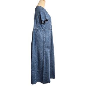 Stylish blue denim maxi dress with short sleeves and a unique front design. Pullover style. No stretch Size and fabric tag faded