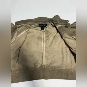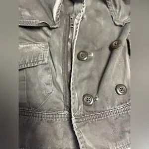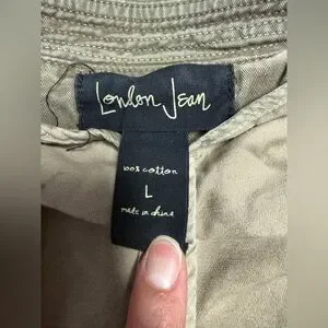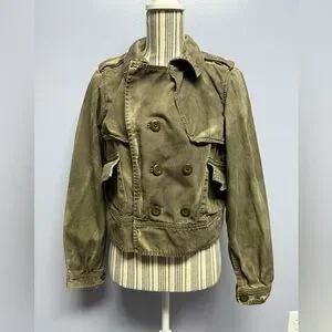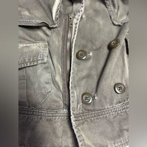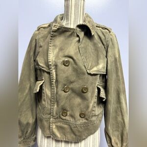 Olive jacket with button details. Perfect for layering. London Jean olive distressed double breasted cropped long sleeve utility jacket women’s size L, in excellent preloved condition.