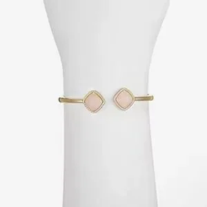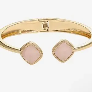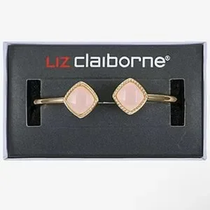 This Liz Claiborne elegant bracelet features a stunning pink quartz stone set in a sleek gold band. Perfect for adding a touch of sophistication to any outfit. It features two cushion-cut stones and comes beautifully packaged in a gift box.