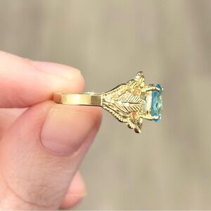 Vintage Swiss Blue Topaz Gold Ring: 14K Beverly Hills Laurel Leaf Solitaire