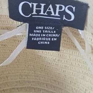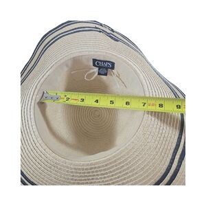 Elevate your style as you sit on the beach, sipping your favorite beverage while protecting your skin. This beautiful Chaps brand wide-brimmed straw sun hat. The hat is a natural or ivory color with navy blue stripes and a twisted rope accent with a small bow.