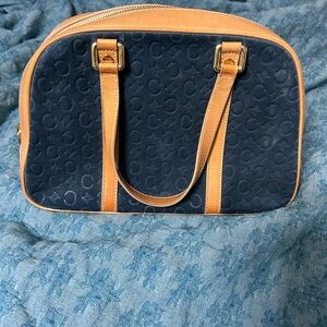 Vintage Celine Navy Velvet and Tan Shoulder Bag
