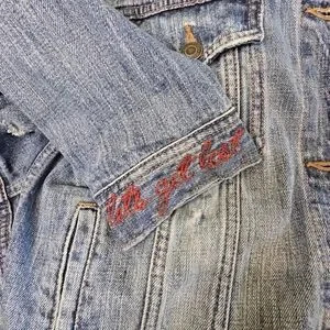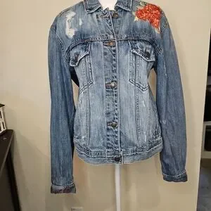 Elevate your style with this classic denim jacket, featuring striking red floral details. Perfect for a chic, casual look.