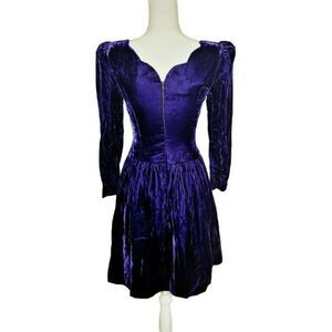 VTG 80’s Joan Leslie Purple Velvet Fit Flare Mini Scallop Neck Dress 2 Petite.