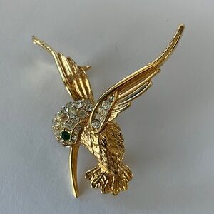 Vintage gold-tone hummingbird brooch featuring clear crystal rhinestones on the head and wings, and a green rhinestone for the eye.