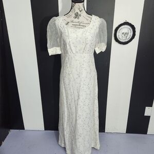 Charming maxi dress with delicate lavender floral accents. Features puff sleeves and a classic silhouette. Ideal for any occasion.