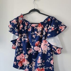 Womens Blouse Top Small Navy Blue Floral Ruffle Off-Shoulder