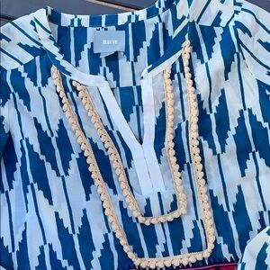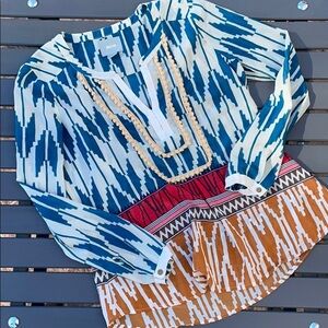 Dress up or dress down this beautiful long sleeve top from Anthropology. Detail on front includes ribbon and trim which adds a nice feminine touch. 100% polyester. Colors are vibrant and in excellent condition. Comes from a Smoke free home.