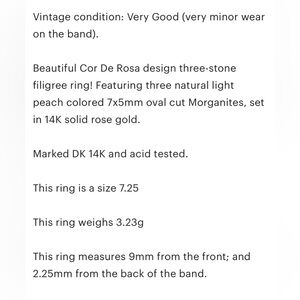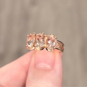 Beautiful three-stone filigree ring! Featuring three natural light peach colored 7x5mm oval cut Morganites, set in 14K solid rose gold.
