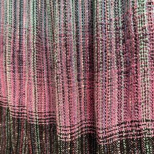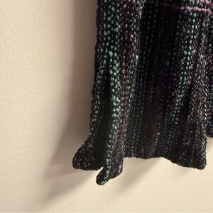 Details- This is a vintage handmade woven knit A-line skirt that features a beautiful ombre color scheme in black, purple and teal. Small slits on each side although when I wore it I liked to put them front to back. Elastic waist. Lightweight and not scratchy like some other knit skirts can be!