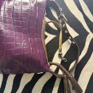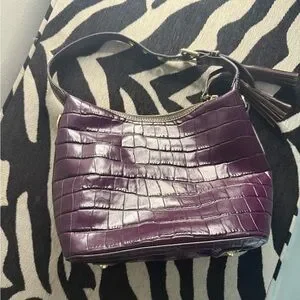 Elegant plum croc-embossed leather. Features a stylish tassel accent. Perfect for any occasion.