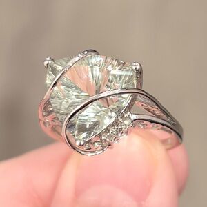 Beautiful and bold large solitaire/statement ring! Featuring a faint green 12mm trilliant/millenium cut Prasiolite (Green Amethyst), and four 0.005 Diamond accents; set in 14K solid white gold.