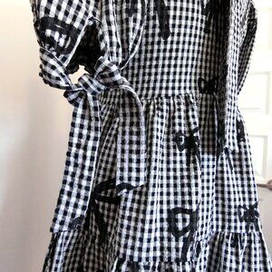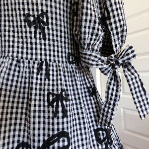 Playful and statement-making Lazy Oaf dress in classic black-and-white gingham with an all-over bow print. Features a square neckline with front tie detail, puff sleeves with adjustable side bows, and a tiered babydoll silhouette. Finished with a dramatic oversized bow at the back neckline.
