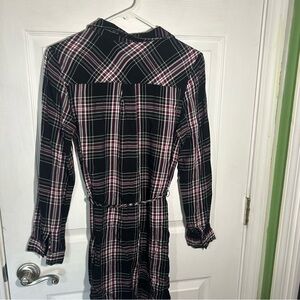 Classic plaid shirt dress with button-up front. Comfortable and stylish. Cute with flats, sneakers or cowboy boots.