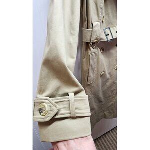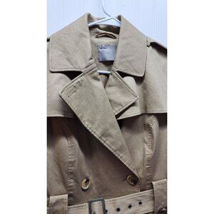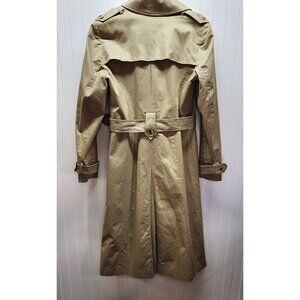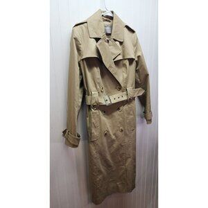 This timeless beige trench coat offers a classic look with its double-breasted design and belted waist for a tailored fit. Constructed from durable cotton, it provides both style and functionality, suitable for professional settings or a polished casual appearance.
