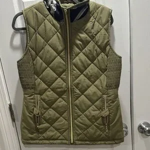 Stylish quilted vest featuring an equestrian-themed print. Olive green with navy and silver accents.