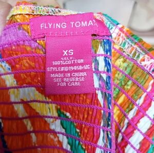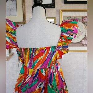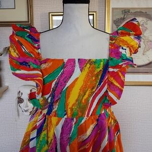 Vibrant dress with ruffled sleeves. Perfect for casual outings.