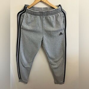 Experience ultimate comfort and style with these Adidas sweatpants, featuring a sleek gray design with iconic black stripes. The jogger-style fit tapers towards the ankles, making them perfect for both athletic activities and casual wear. Crafted from a soft cotton blend, these sweatpants offer a classic look with a modern twist.