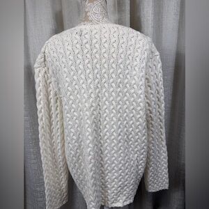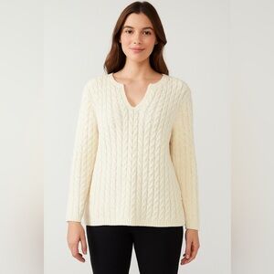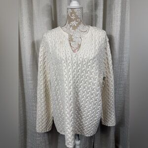Timeless Liz Claiborne cable knit sweater in soft cream ivory. Features a flattering V-neckline, textured knit design, and cozy cotton-acrylic blend. Perfect for layering in fall and winter. Women’s Plus 2X – Excellent condition.